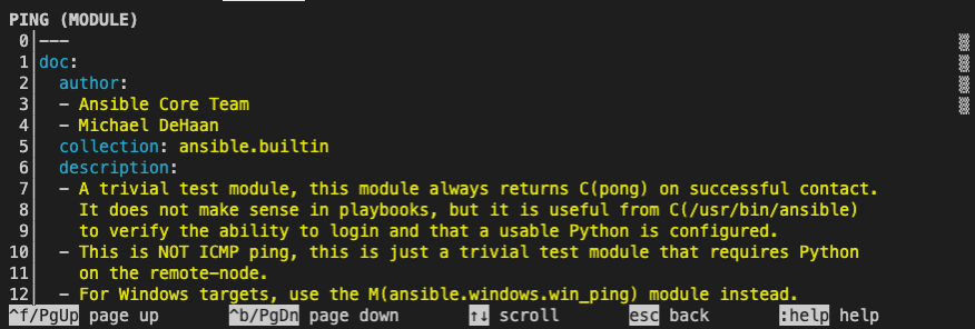 $ ansible-navigator doc -l -eei ee-supported-rhel8 -