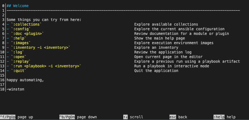 ansible-navigator welcome will show the text user interface (TUI) of Ansible Navigator with instructions and subcommands. (You will get the same interface when you execute ansible-navigator without any arguments)