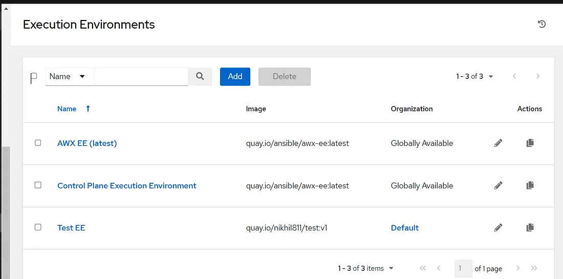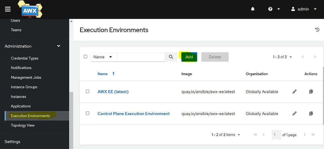 Now we need to add a new Execution environment image on AWX. Log in to your AWX UI. Click on the “Execution Environments” option on the left-hand side of the AWX UI and Click on the “Add” button to create a new execution environment.