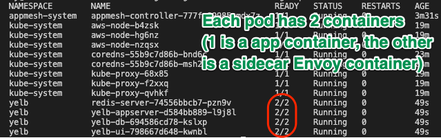 - The deletion of yeld pods will make trigger the creation of new pods with the Envoy sidecars . To validate that the controller, check the number of containers running in each pod: