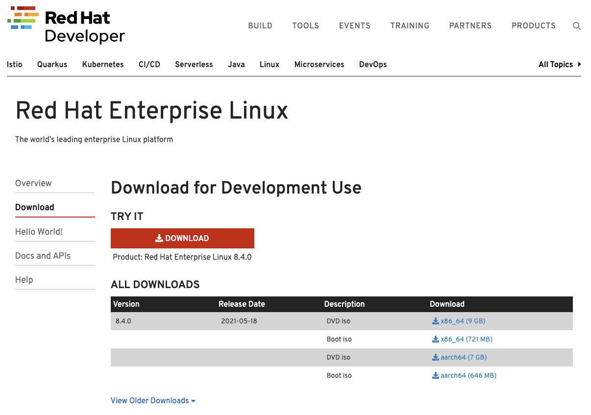 By default the screen will show the latest available RHEL versions only. If you want to download an older version of RHEL (eg: RHEL8.2), then find the View Older Downloads link as below.