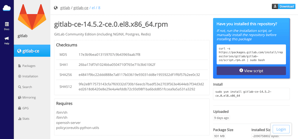 Since we cannot simple install GitLab using package managers (yum, dnf, apt), we need to download the the package manually (from a machine with internet access) and transfer to the server.Download the package from packages.gitlab.com and in my case I am installing GitLab Ce on a RHEL8 server (Red Hat Enterprise Linux).