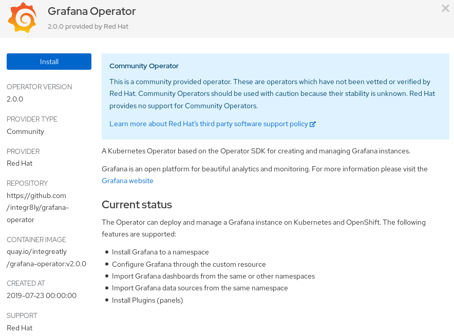 Login to the Console, as user with cluster-admin role, and: – Navigate to Operators :: OperatorHub – Type Grafana into the filter box to find Grafana Operator – Click Grafana Operator to display information about the Operator, You can learn about Red Hat’s 3rd Party Software Support Policy from the Notification Box. Click Continue