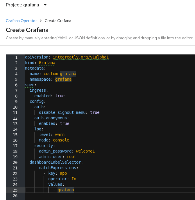 Create Grafana Instance: 1. Navigate to Installed Operators , and Click Grafana Operator (Make sure we are in grafana Project) 2. Click Create Instance on Grafana Card