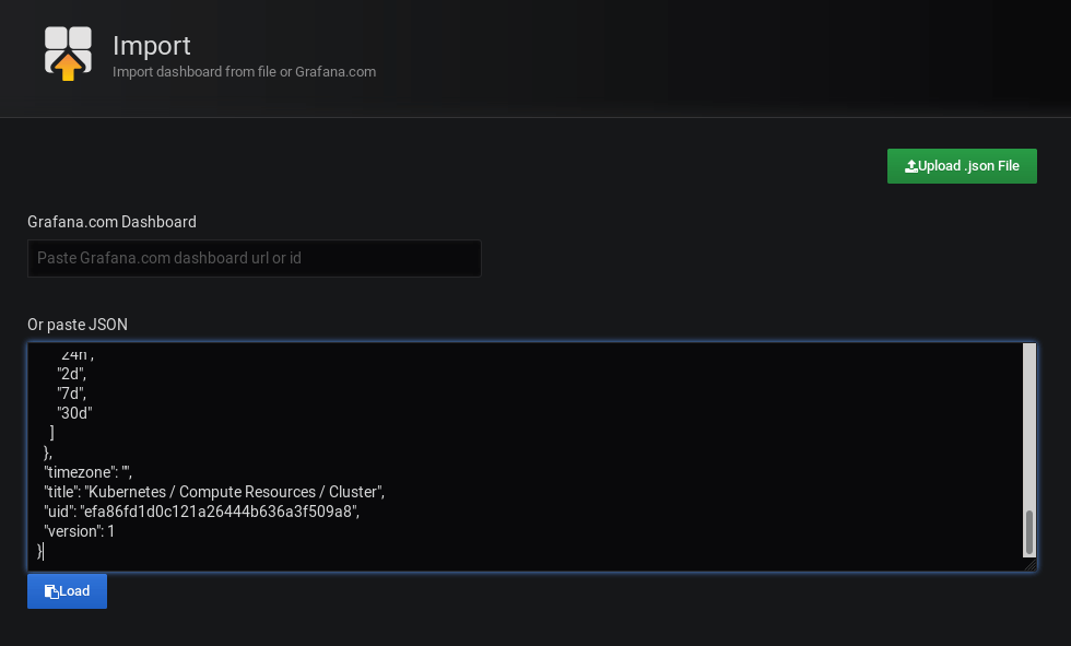 Now, Administrator can create the custom Dashboards. e.g: 1. Login to OpenShift Monitoring Stack Grafana 2. Select one of Dashboard, Kubernetes / Compute Resources / Cluster 3. Click Share Dashboard Icon 4. Click View JSON button from Export Tab, and Click Copy to Clipboard button 5. From Custom Grafana Instance, Click Dashboards Icon, and Click Manage 6. Click Import button, Paste , and click Load Button