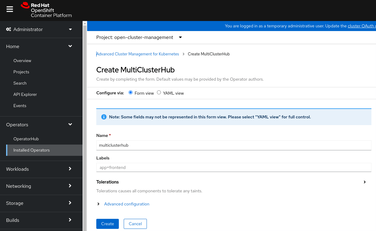 On the Create MulticlusterHub page, leave the default values, and click Create. You are redirected to the MultiClusterHubs tab.