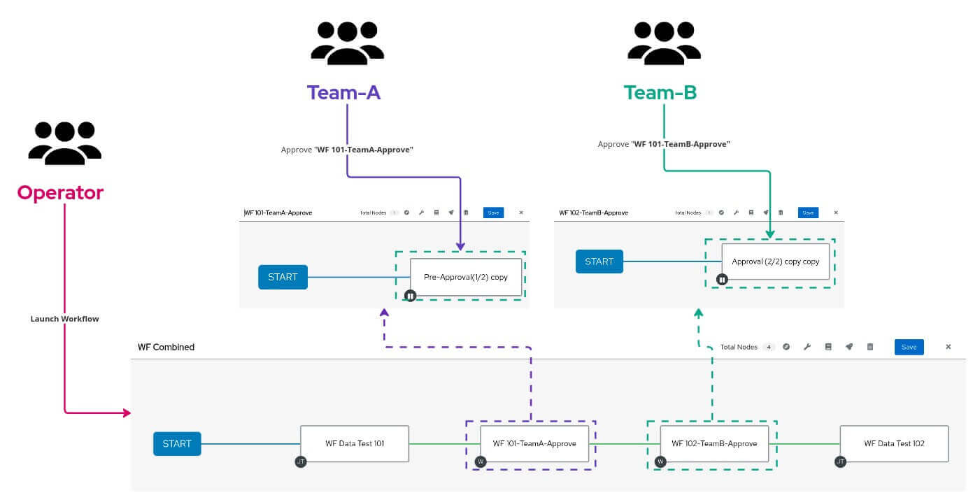 Team-Bsolely interacts with the “ WF 102-TeamB-Approve ” node. - This ensures a sequential approval process where each team approves their designated step before the workflow progresses to the next team and ultimately, the remaining tasks in the main workflow.