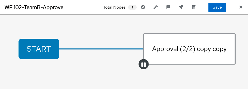 By inserting the “Approval-only” workflows ( WF 101-TeamA-Approve and WF 102-TeamB-Approve ) between Nodes 1 and 4, you create a sequential approval process.