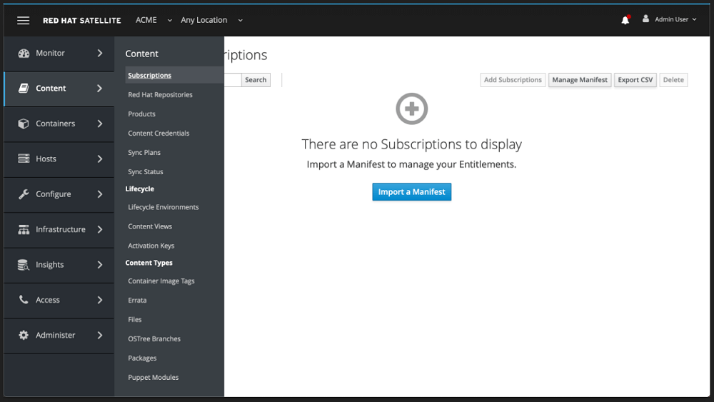 Open Satellite Server Web Console, Content -> Subscriptions -> Manage Manifest